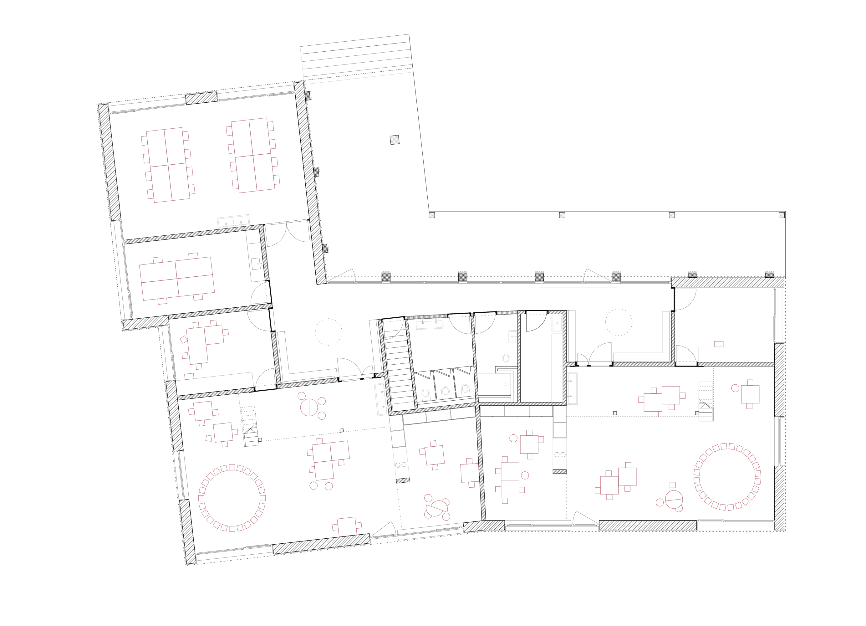 Als Ausgangslage bestand die Aufgabe darin, einen bestehenden Dreifachkindergarten mit zwei weiteren Einheiten in einem separaten Gebäude zu ergänzen. Das neue Gebäude setzt das gestalterische Prinzip des Altbaus fort. Sein winkelförmiges Volumen formt mit dem Bestanden ein Ensemble, in dessen Mitte ein gemeinsam genutzter Hof zu liegen kommt. Im Süden des Neubaus wird ein geschützter, ruhiger Aussenraum für die beiden neuen Klassen geschaffen. Die südseitigen Haupträume setzen sich mit ihrer Überhöhe markant in Szene und lassen von drei Seiten her Licht ins Innere. Die bewegte Dachlandschaft tritt in Dialog mit den differenzierten Satteldächern des Altbaus.